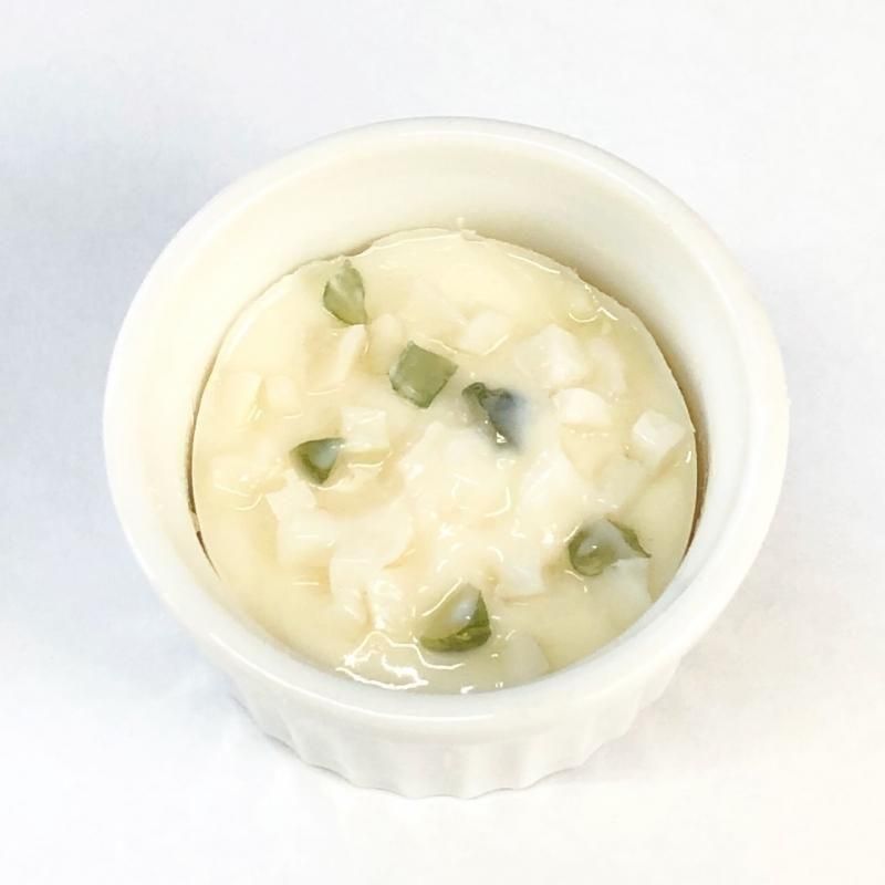 ■白い器に入った、ピクルス入りタルタルソースの食品サンプルです。ソース部分と器の間に少し隙間がございますがご容赦ください。(商品写真にてご確認くださいますようお願い申し上げます。)
