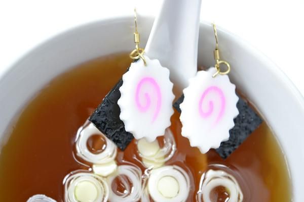 ■ラーメンのトッピング具材としてポピュラーな、なるとと焼き海苔をピアスにしました。特別に作った小さななふとです。