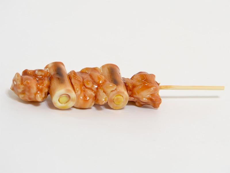 ■串に刺さった焼き鳥の食品サンプルです。丸い竹の串鶏肉とネギが交互にささっています。